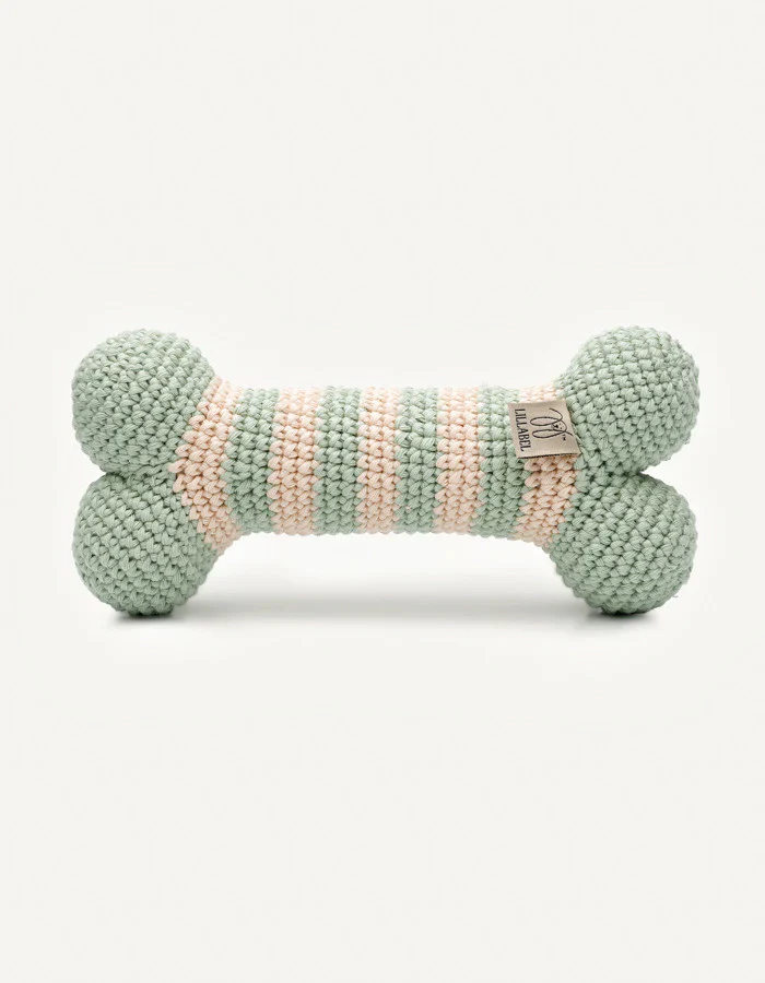 Jouet pour chien en crochet en forme d’os, fabriqué à la main en fil de coton biologique. Ses couleurs, ses textures et ses sons stimulent tous les sens de votre compagnon à quatre pattes, tout en restant doux et agréable à mâchouiller.