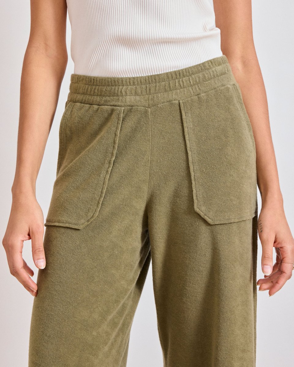 Pantalon femme d’inspiration jogging en éponge. Coupe droite avec taille élastique, deux poches plaquées devant et une poche plaquée au dos. Fentes aux chevilles.