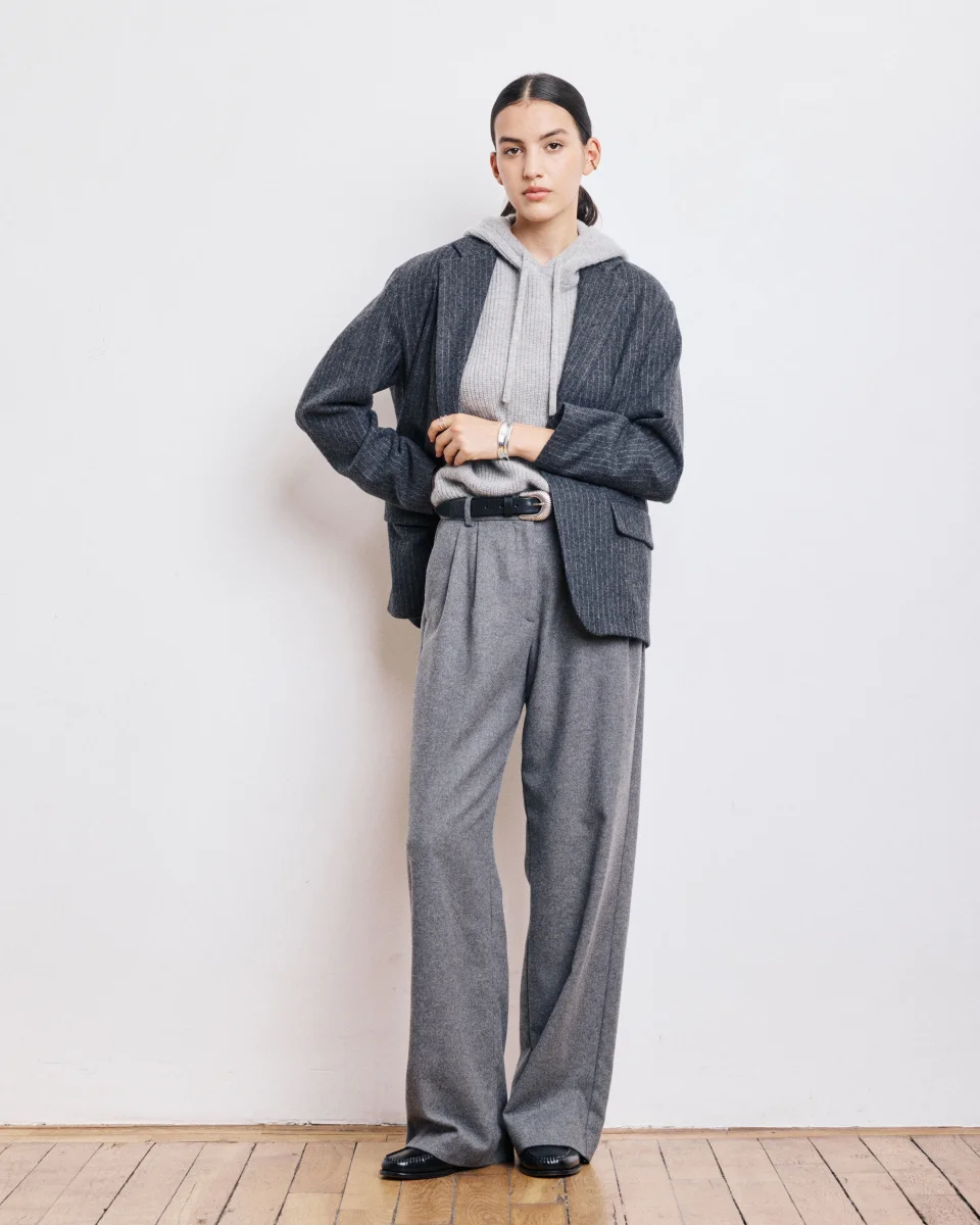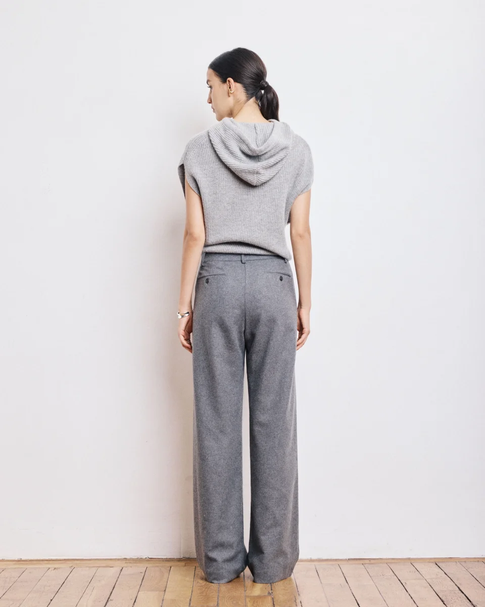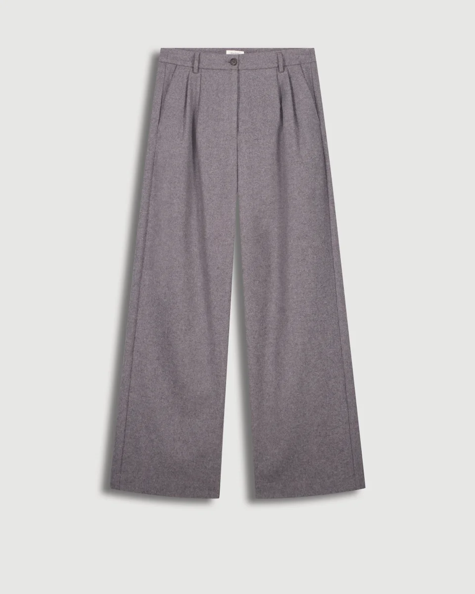 Pantalon femme large en flanelle de laine unie, taille haute. Ceinture plate avec passant, fermeture à glissière avec bouton à la taille. Poches italiennes sur les côtés et poches passepoilées boutonnées dans le dos.