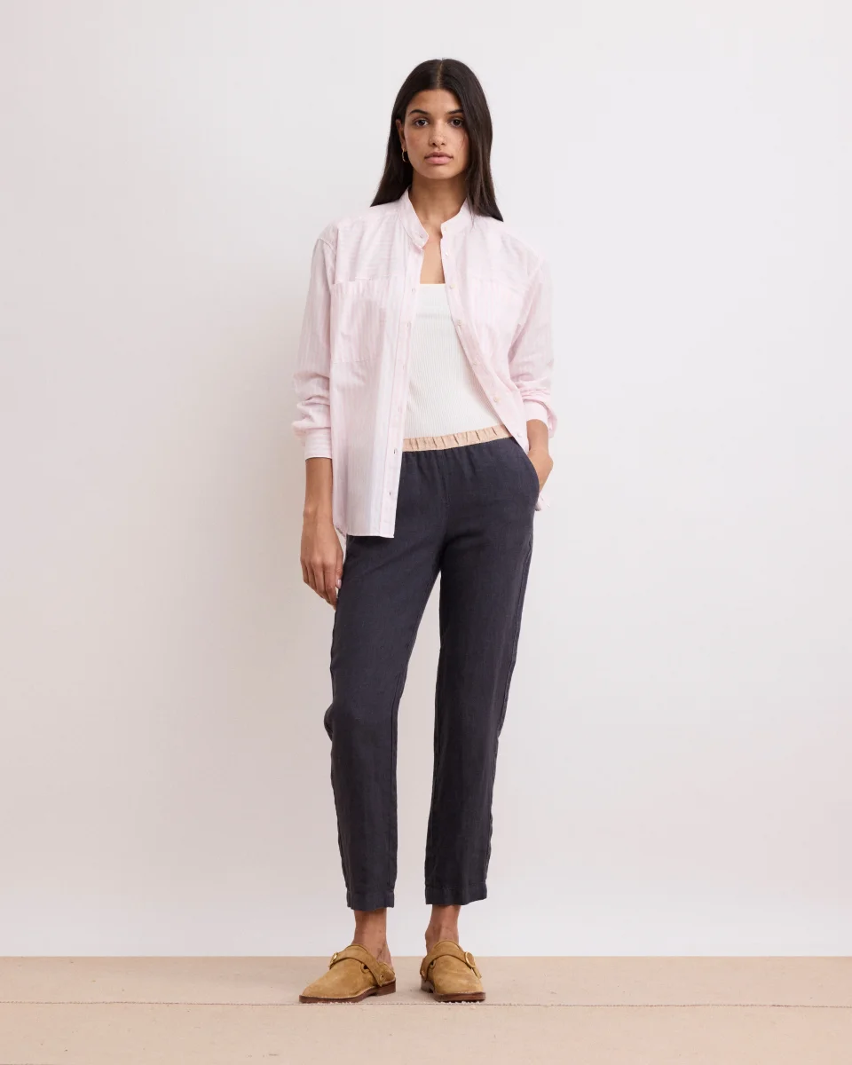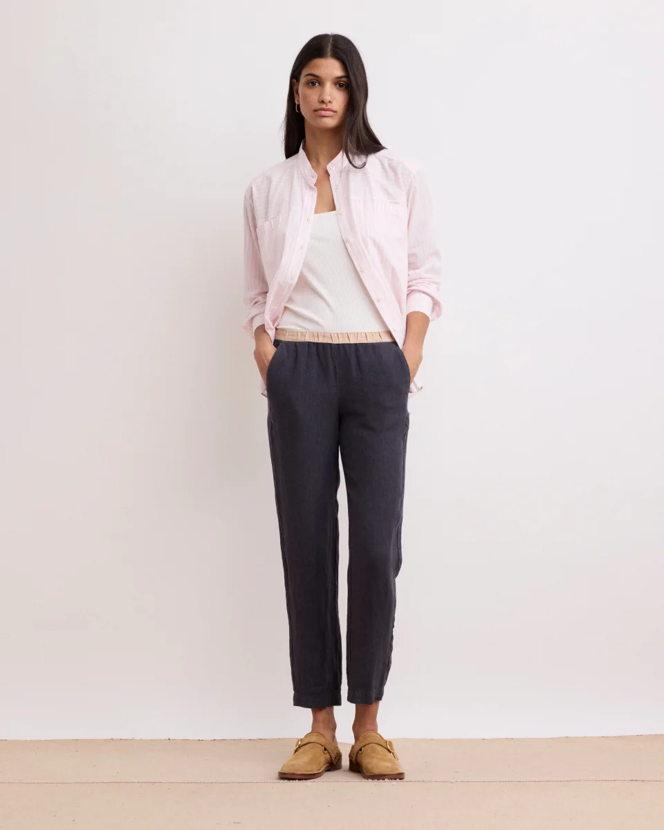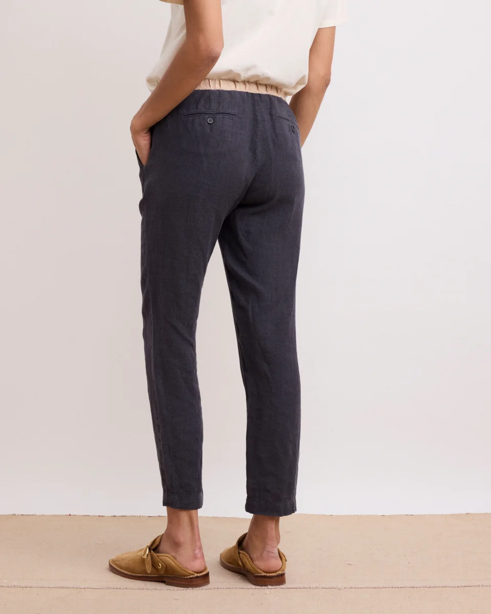 Pantalon femme coupe cigarette en lin avec ceinture élastique plissé beige. Taille basse, deux poches italiennes sur les côtés et deux poches passepoilées boutonnées dans le dos. Longueur 7/8ème.