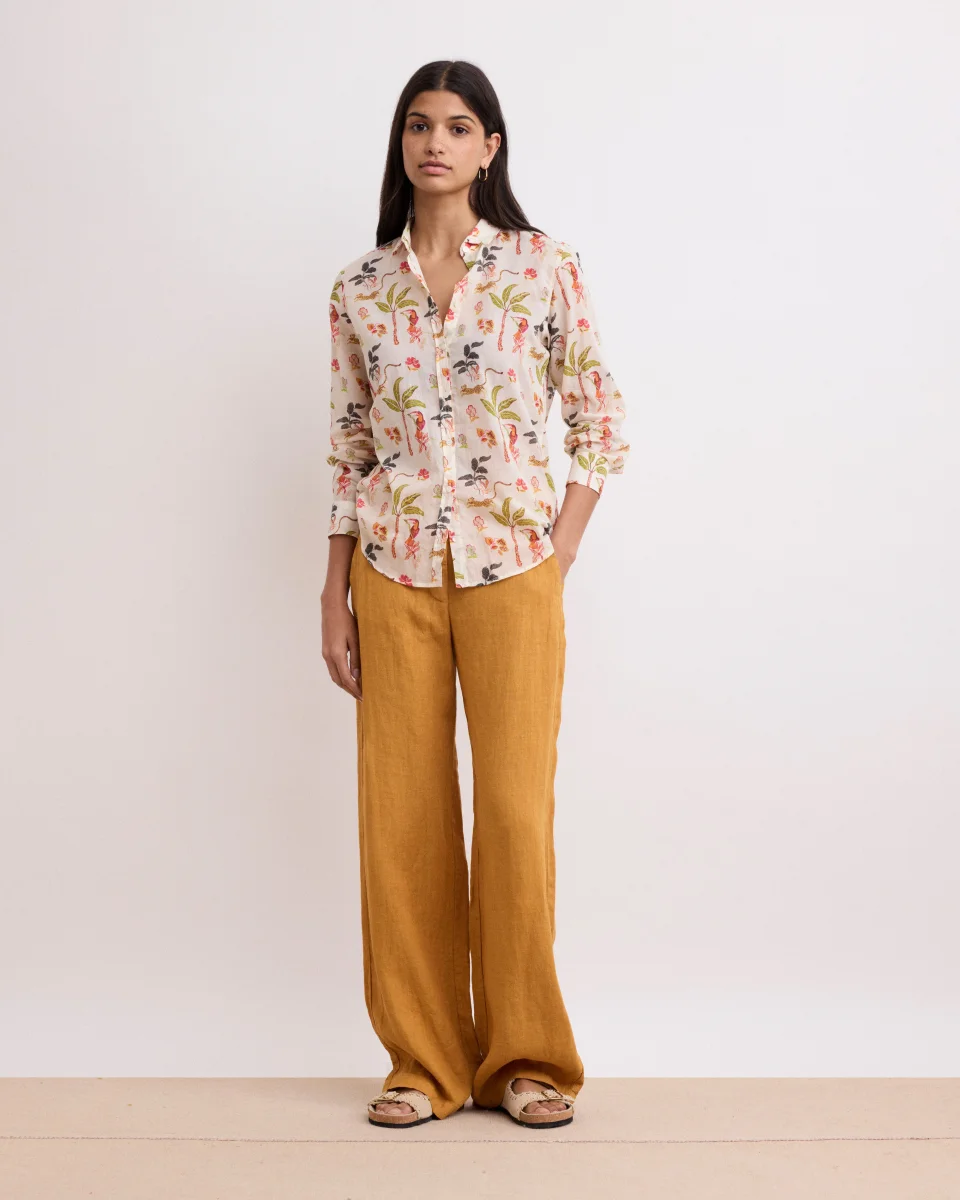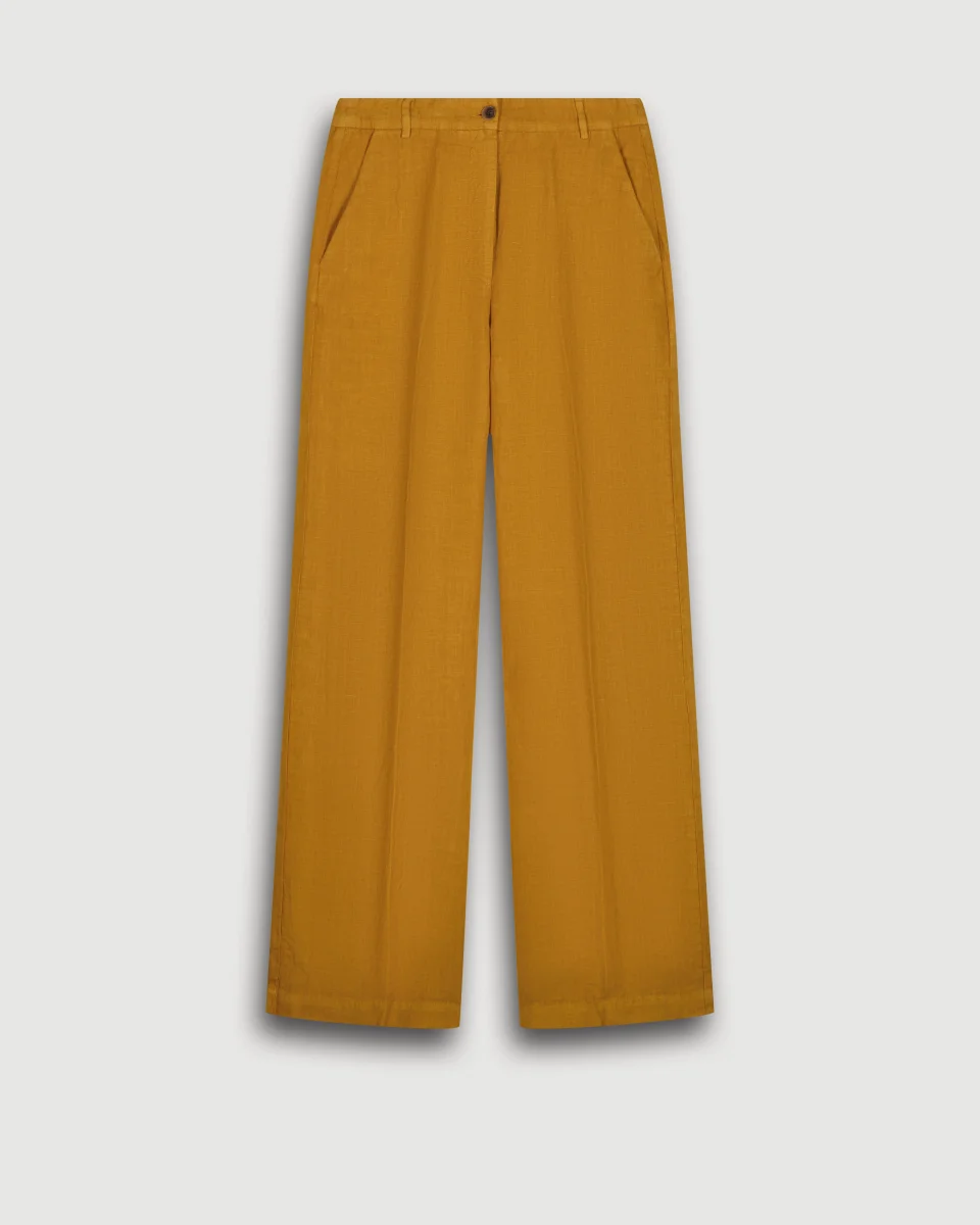 Pantalon femme large et fluide en lin. Taille haute, ceinture plate avec passants et fermeture glissière. Deux poches italiennes sur les côtés et deux poches passepoilées au dos.