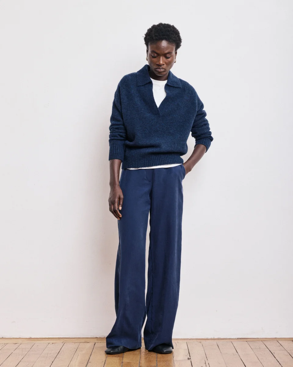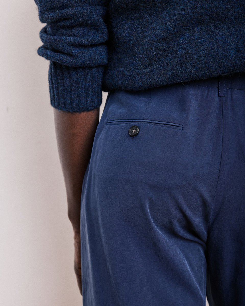 Pantalon femme large et fluide en modal uni bleu marine au toucher peau de pêche. Taille haute, ceinture plate avec passants et fermeture à glissière. Deux poches italiennes sur les côtés et deux poches passepoilées boutonnées au dos.