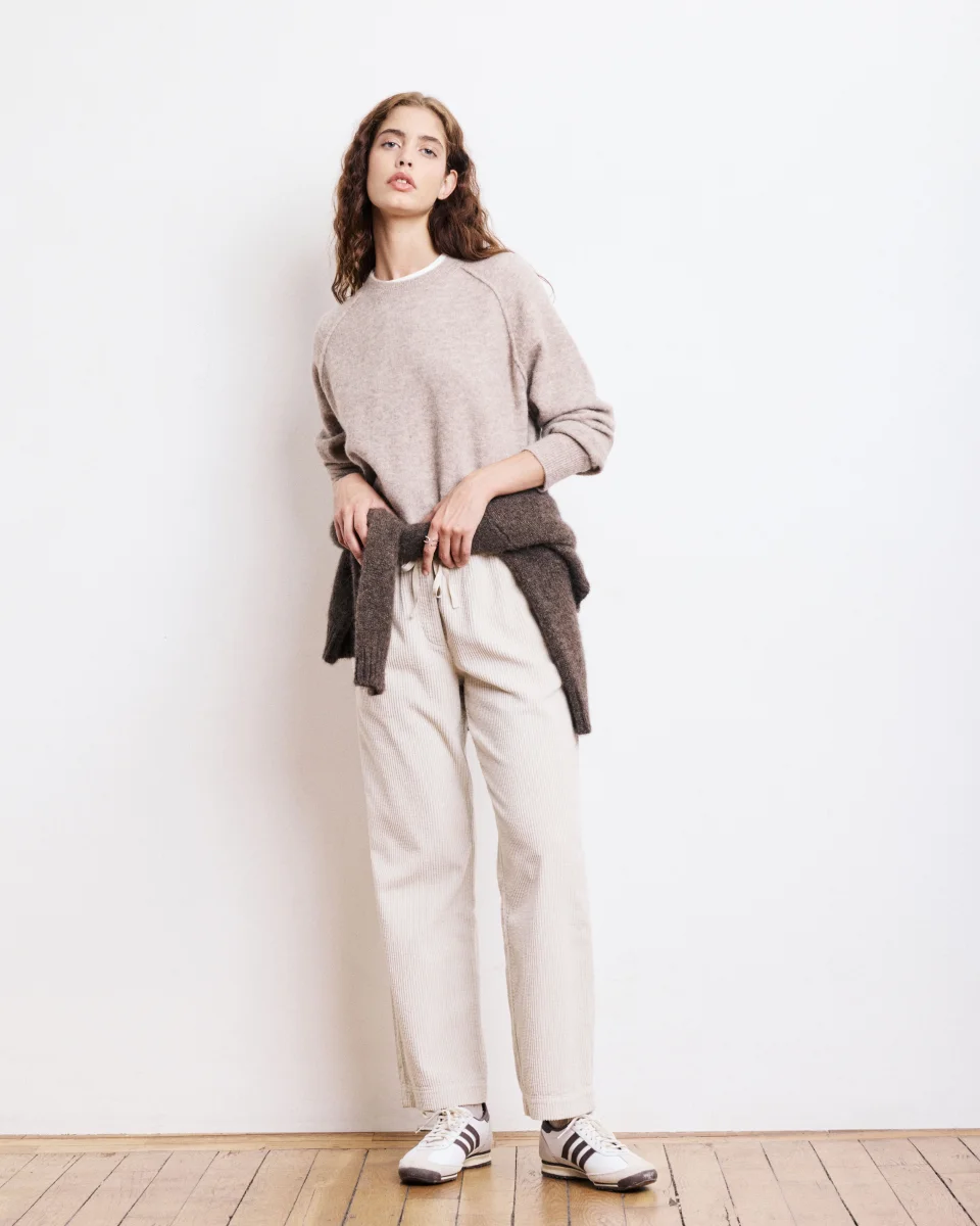 Pantalon femme droit en velours seersucker à taille élastique avec lien de serrage. Deux poches italiennes sur les côtés et deux poches passepoilées boutonnées au dos.