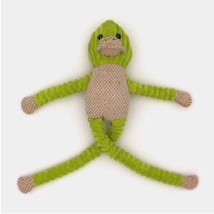 Conçue en tissu avec des coutures, cette peluche est idéale pour les moments de câlins ou de jeu modéré. Elle n’est pas adaptée aux chiens ayant tendance à déchiqueter leurs jouets.