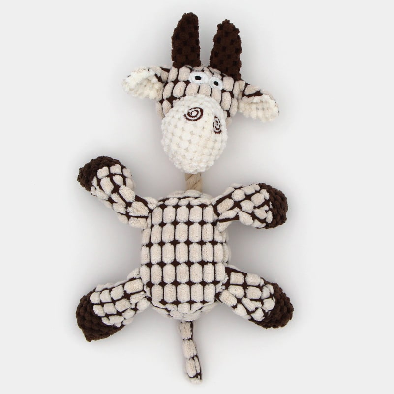 Cette peluche en forme de vache blanche et marron, deviendra le copain de jeu de votre chien ! Elle est constituée de deux tissus, en mailles gaufrée et côtelée et ne craint qu’une chose, c’est que le chien lui torde le cou ! La peluche est très douce et couine pour stimuler le chien pendant le jeu.