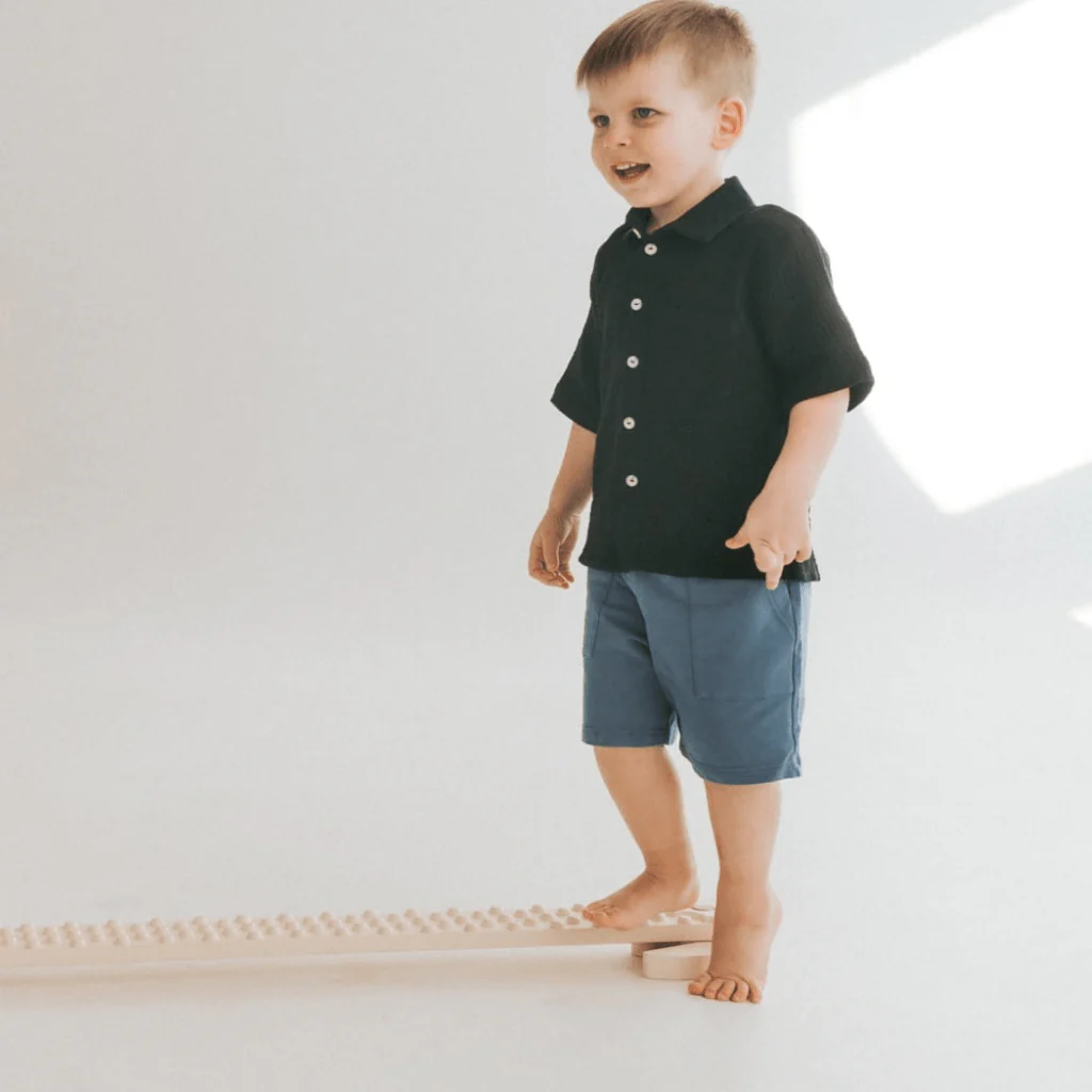 Invitez votre enfant à travailler l’équilibre en jouant : une face à picots pour stimuler la voûte plantaire, une face lisse pour l’entraînement classique.