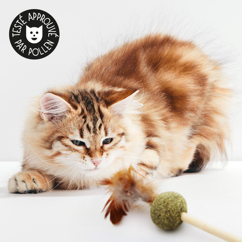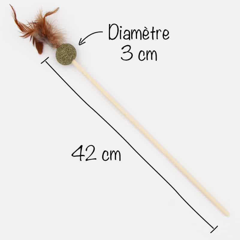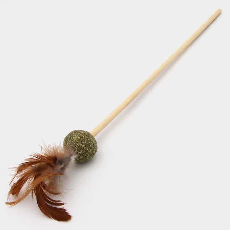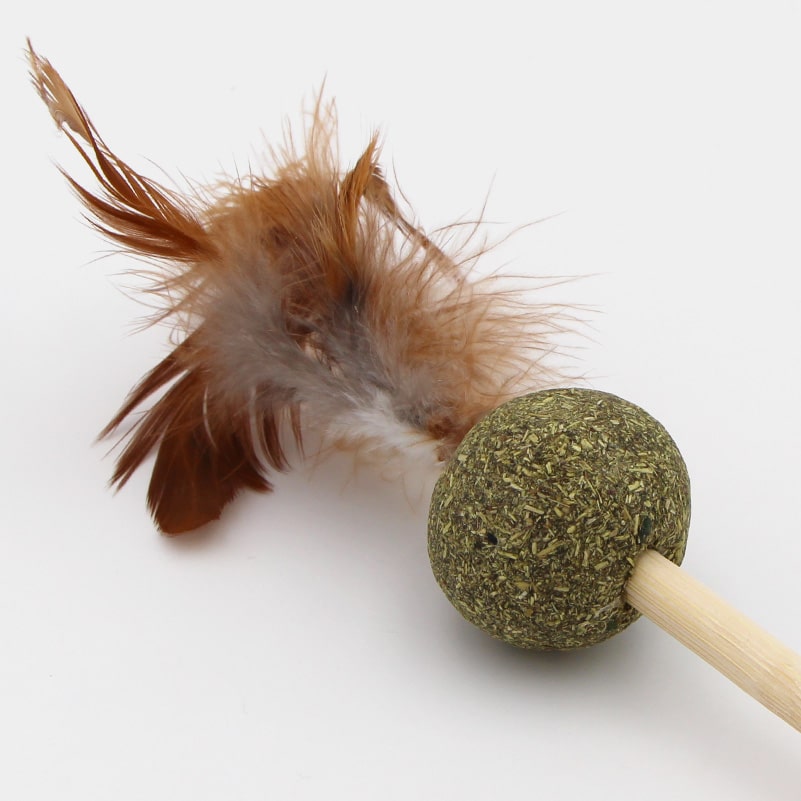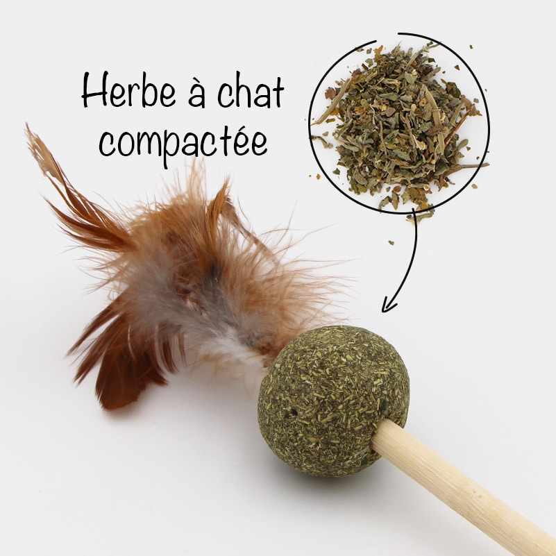 Le jouet est constitué d’une longue baguette en bois au bout de laquelle sont fixées une balle d’herbe à chat compactée et des plumes. L’herbe à chat est 100% naturelle.