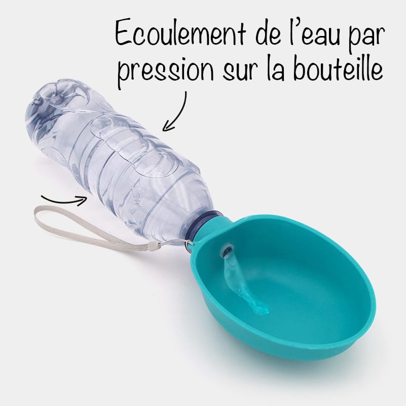 Ce bol en plastique se visse sur le goulot d’une bouteille, permettant ainsi de transporter l’eau de votre chat ou de votre chien mais également de le faire boire !
