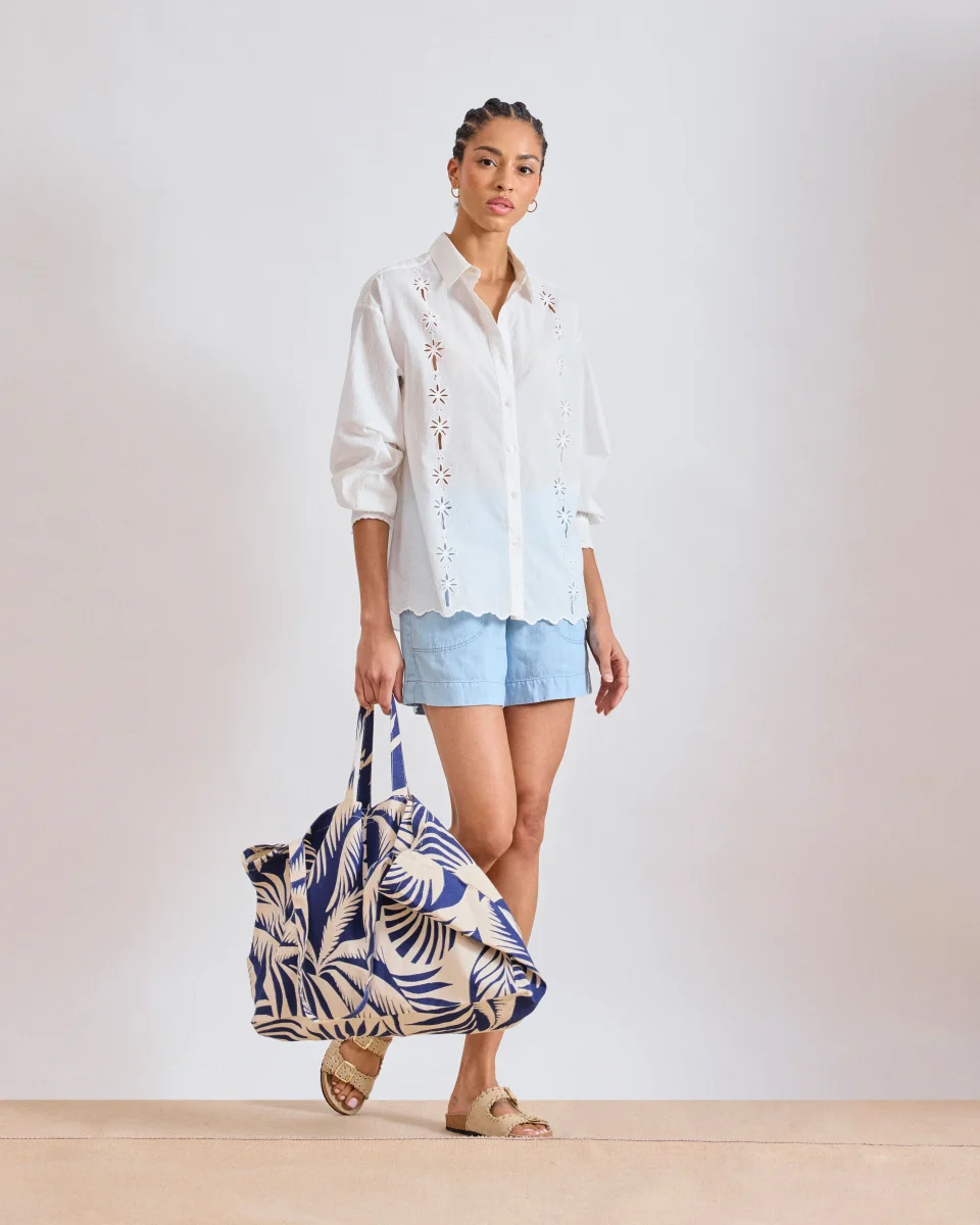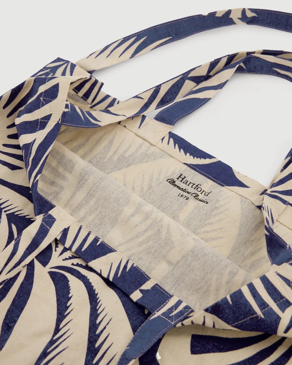Sac cabas en toile de coton à double anse de tailles différentes, petite poche intérieure. Imprimé exclusif palmiers.