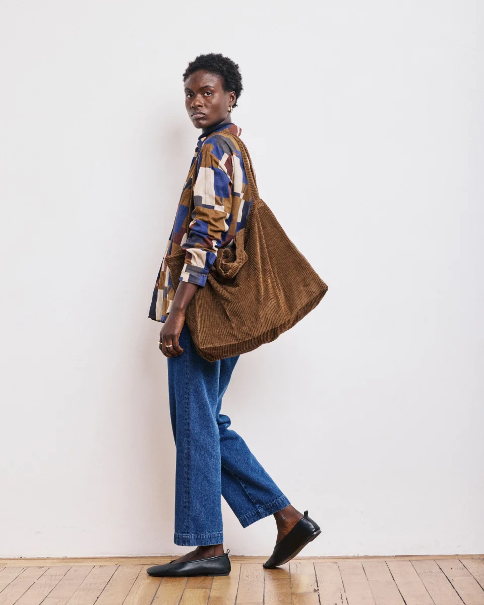 Sac cabas en velours côtelé à double anse de tailles différentes, petite poche intérieur.