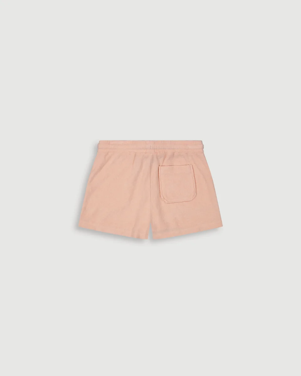Short fille court en éponge. Taille élastique avec un lien coulissant écru. Deux poches plaquées devant et une poche plaquée à l’arrière.