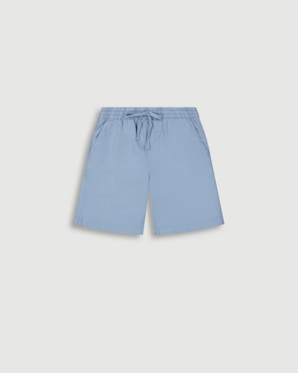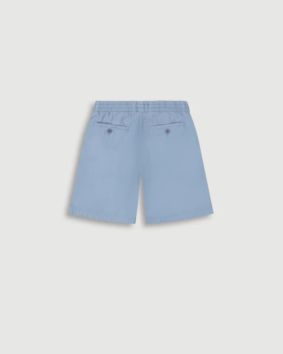 Short enfant garçon ample à taille élastique avec cordon de serrage, poches italiennes sur les côtés et poches passepoilées boutonnées à l’arrière.