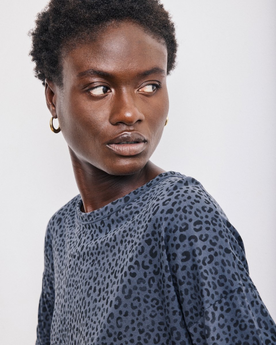 T-shirt femme à col rond et manches longues avec une coupe ample, imprimé all-over léopard. Emmanchures tombantes et détails de finitions bords francs et couture milieu dos.