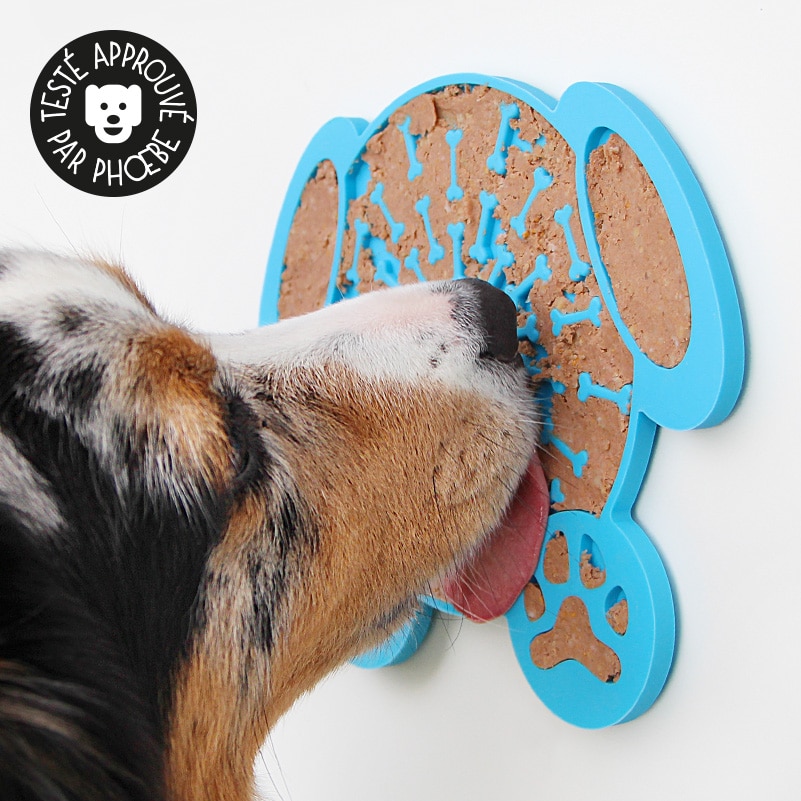 Tartinez le tapis de léchage avec de la pâtée ou un produit laitier crémeux à l’aide d’un couteau (comme du Kiri par exemple) et collez-le sur une paroi verticale à hauteur de la tête de votre chien. Celui-ci s’amusera à lécher l’aliment avec sa langue, ce qui l’occupera un certain temps !