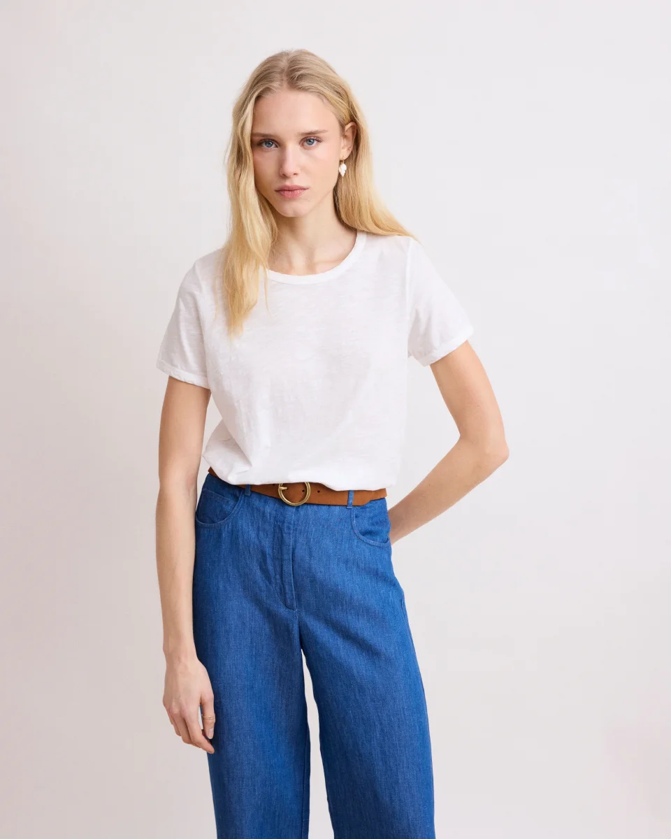 T-shirt femme col rond à manches courtes en coton flammé. Double surpiqûres au col et aux manches.