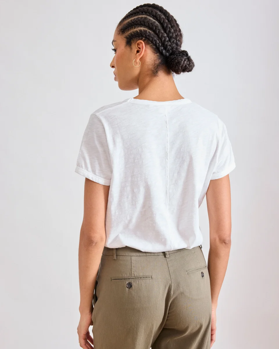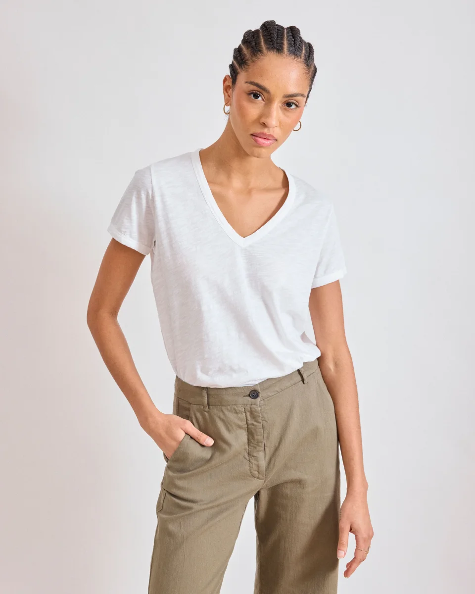 T-shirt femme col V à manches courtes en coton flammé. Double surpiqûres au col et aux manches. Couture milieu dos apparente et fentes sur les côtés.