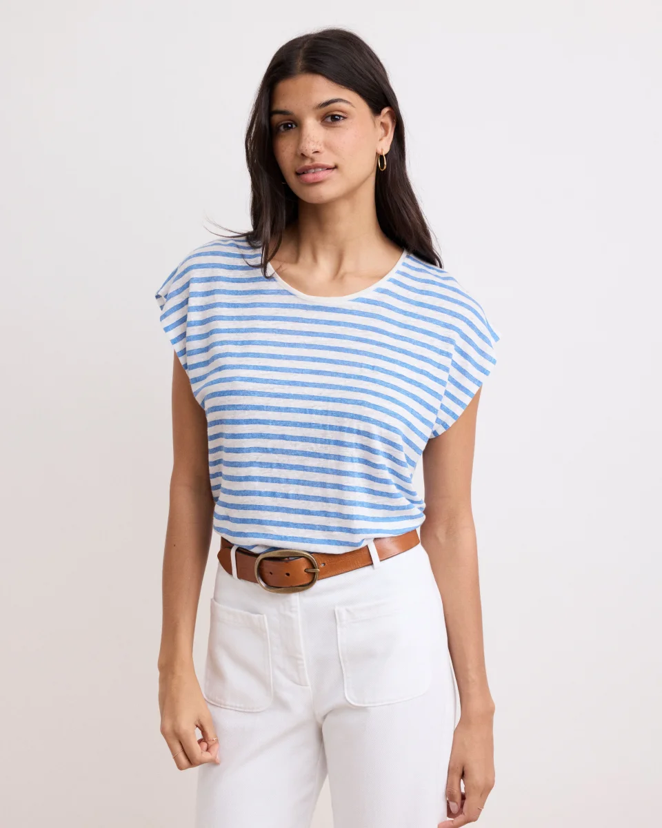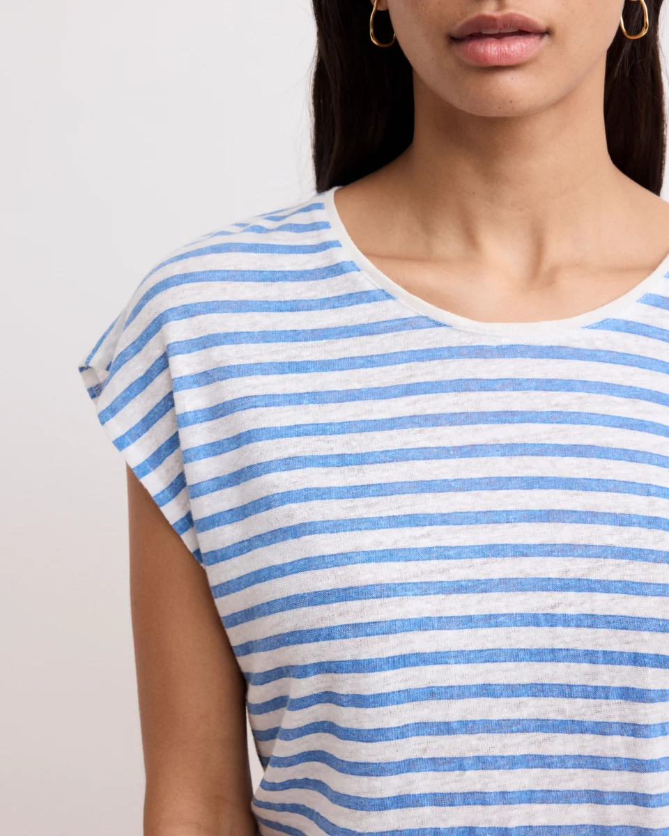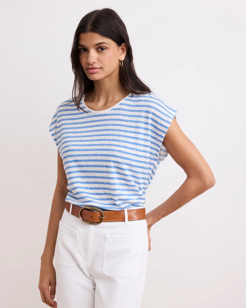 T-shirt femme à col rond, sans manches en lin rayé bleu et blanc.