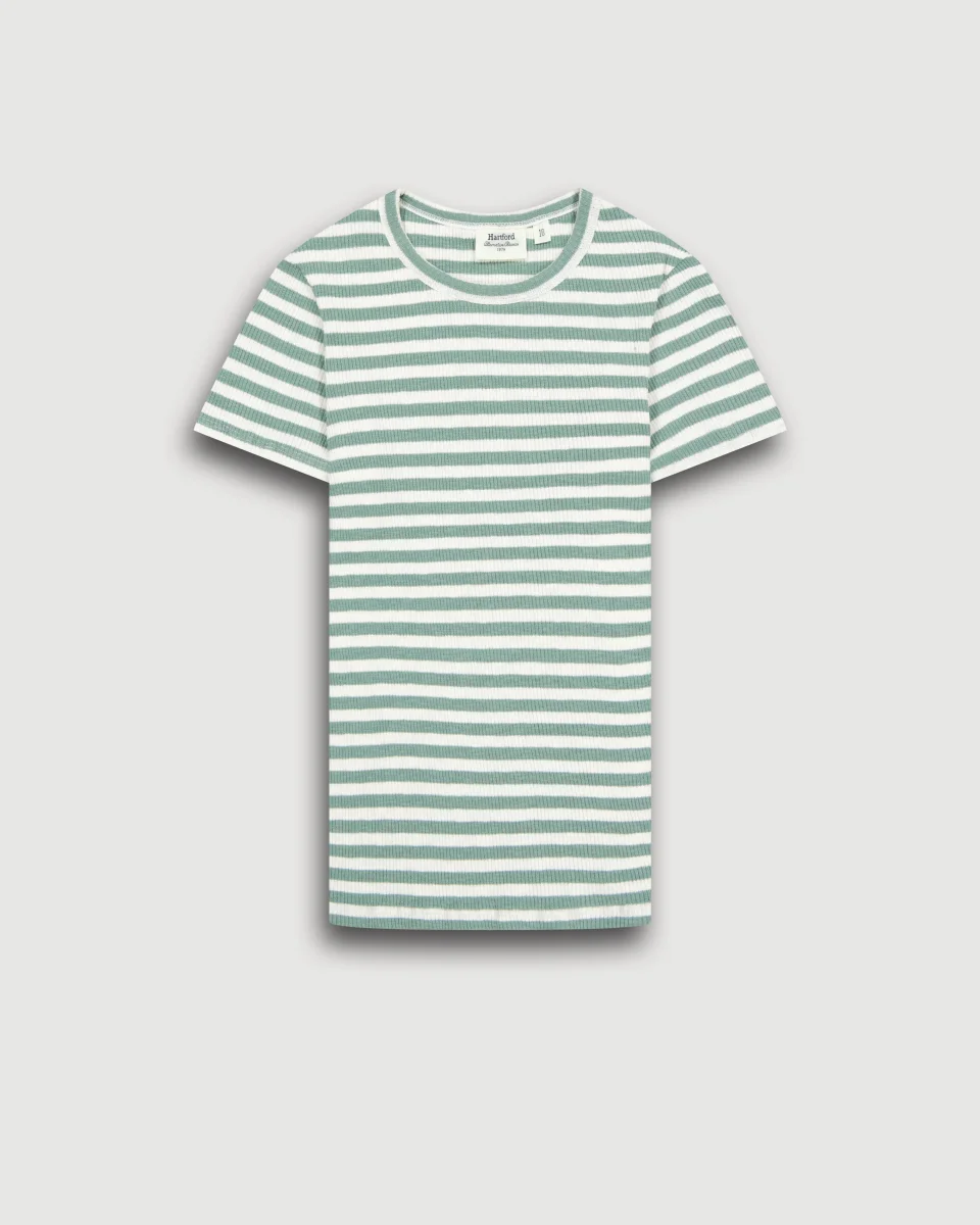 Tee Shirt Fille en Coton Côtelé rayé Ecru & Vert Agave Teofila