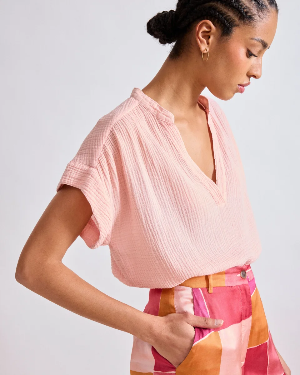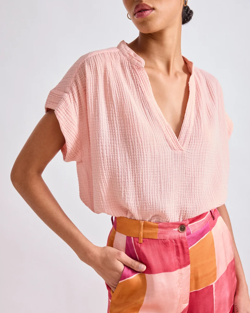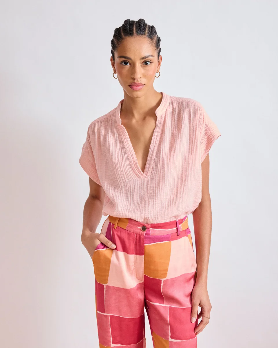 Top femme manches courtes avec encolure V en double gaze de coton. Epaules tombantes avec détails de fronces aux épaules.