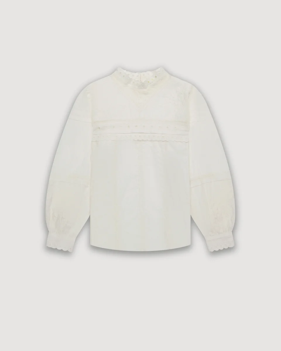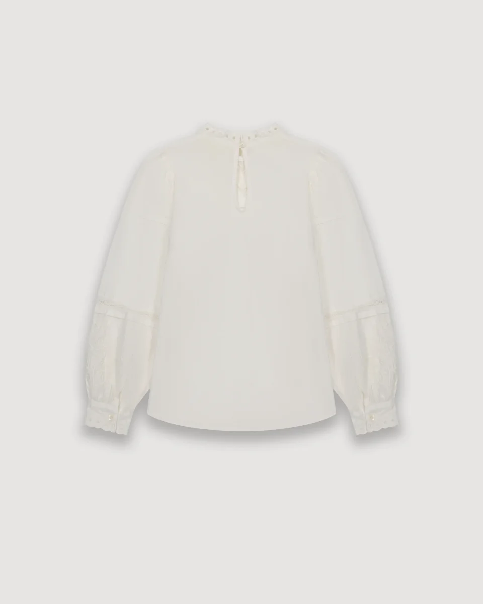 Blouse fille à manches longues en voile de coton avec broderies et dentelles. Manches longues ample avec détails de fronces aux épaules. Détails au col et aux manches.