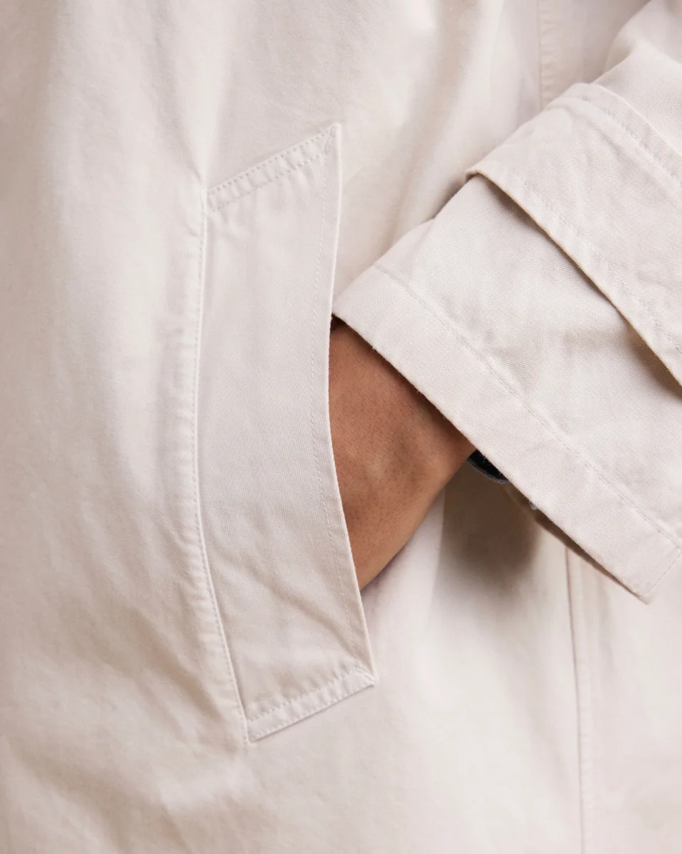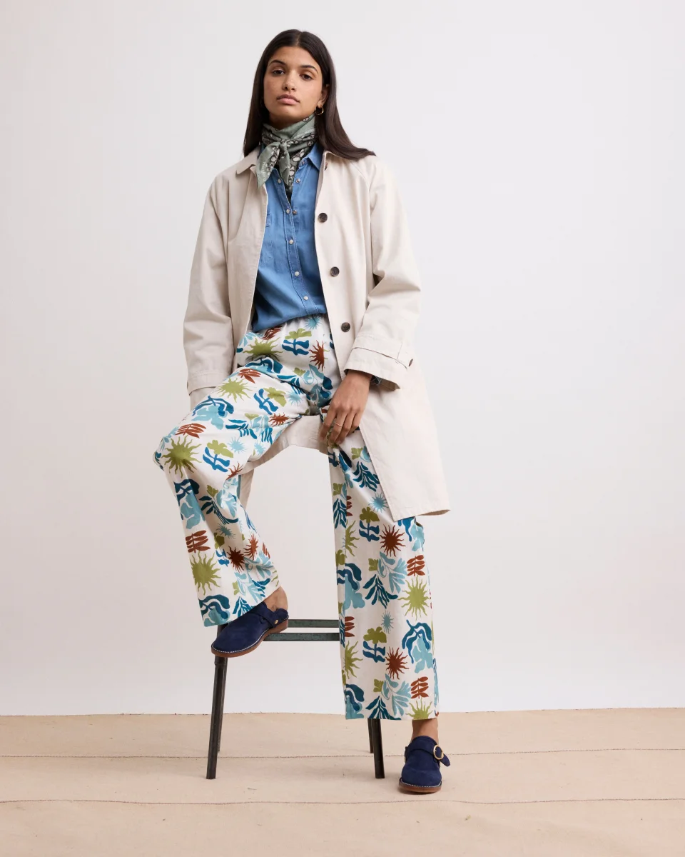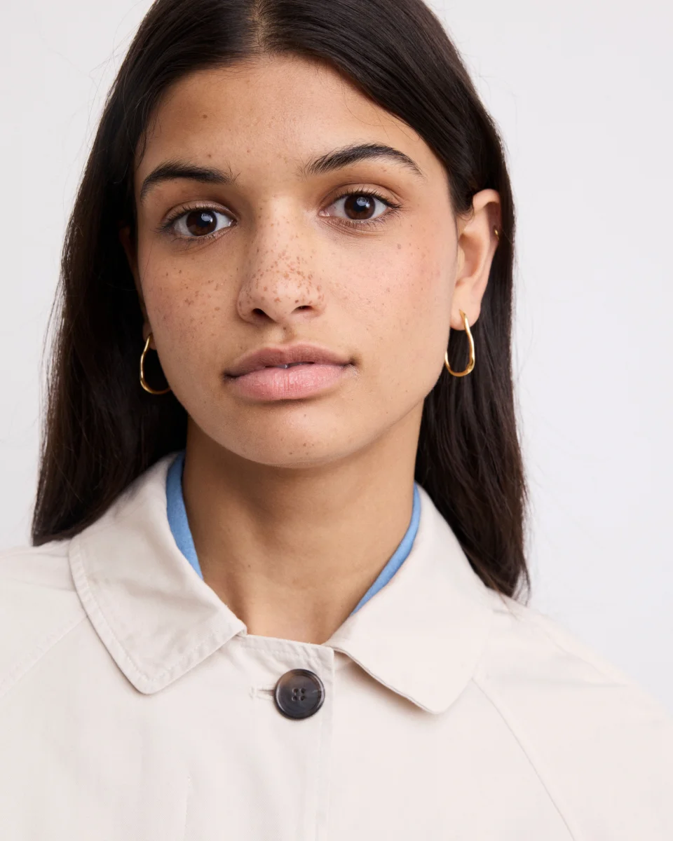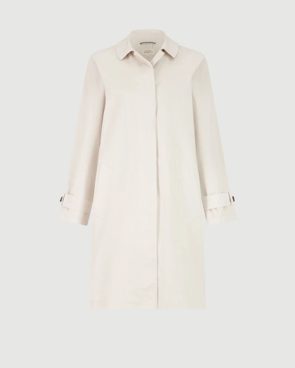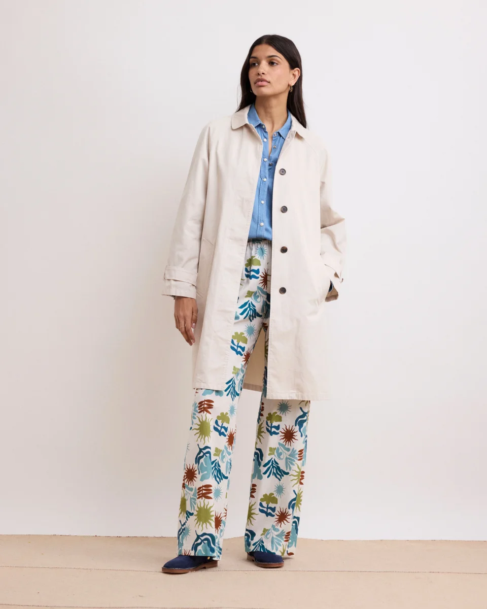 Trench femme Vibrant en gabardine de coton. Emmanchures raglan et manches longues avec patte en bas de manche. Patte de boutonnage invisible et deux poches en biais.