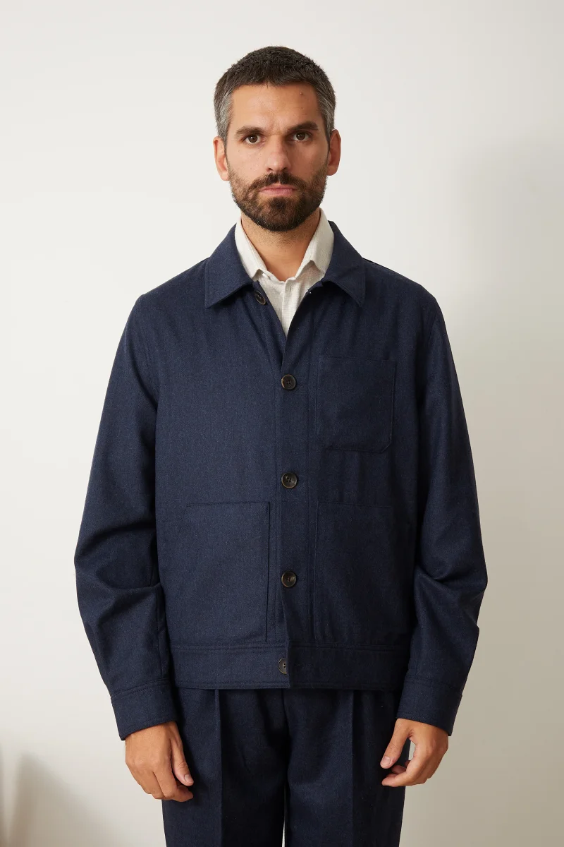 La veste workwear Bergame, inspirée des vestes de peintres, est déclinée dans une délicate flanelle de laine bleu marine pour l’automne et l’hiver. Ses poches plaquées ajoutent du caractère à vos tenues tandis que sa coupe droite légèrement courte dynamise votre silhouette et vous offre de larges possibilités de layering.